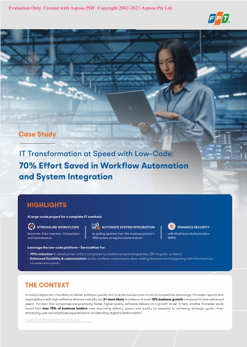 Our client is a world-leading energy group headquartered in Europe. As the company expanded, its IT infrastructure struggled to keep pace with rising demands across departments. Each department operated on separate systems with fragmented priorities, creating silos that hindered cross-functional collaboration, wasted resources and limited the full potential of technology. To solve these issues, the client partnered with FPT to implement the low-code platform ServiceNow for workflow automation and system integration. By harnessing the power of low-code, the company successfully sped up the implementation of these projects, reducing as much as 70% of coding effort compared to traditional development methods.