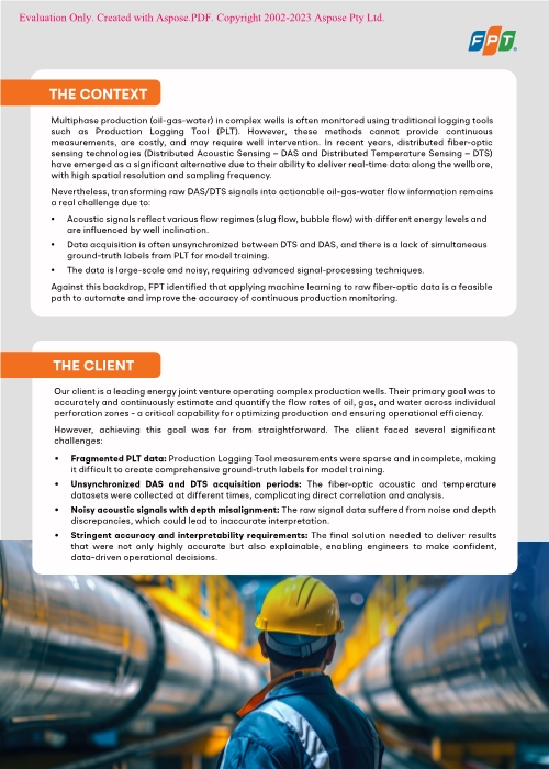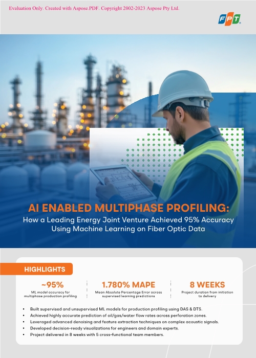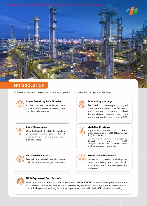 A leading energy joint venture aimed to accurately estimate flow rates of oil, gas, and water across individual perforation zones using raw fiber-optic data. However, the client encountered various challenges, including noisy acoustic signals with depth misalignment, fragmented PLT data, and unsynchronized DAS and DTS acquisition periods. As a solution, FPT applied machine learning with NVIDIA-powered data analysis to overcome these obstacles, enabling high-accuracy, explainable production monitoring.