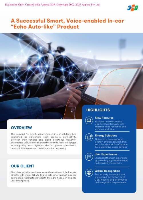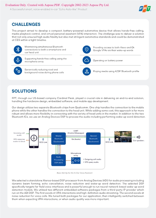 A leading automotive audio equipment provider partnered with FPT to develop a smart, voice-enabled in-car device similar to Echo Auto. The client faced challenges integrating high-fidelity audio, voice assistant functionality, and Bluetooth connectivity within a compact, battery-powered solution. FPT, through our US-based subsidiary Cardinal Peak, delivered a full-stack hardware and software solution featuring dual Qualcomm Bluetooth chips and an ADI DSP for advanced audio processing. The result was a CES-ready prototype that enabled seamless hands-free calling, media control, and voice assistant interaction—enhancing user experience and setting a new benchmark in aftermarket automotive audio.
