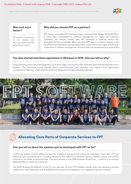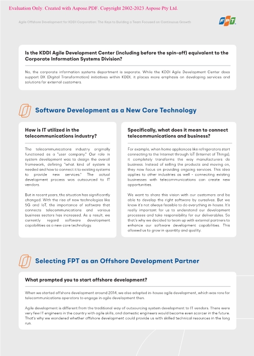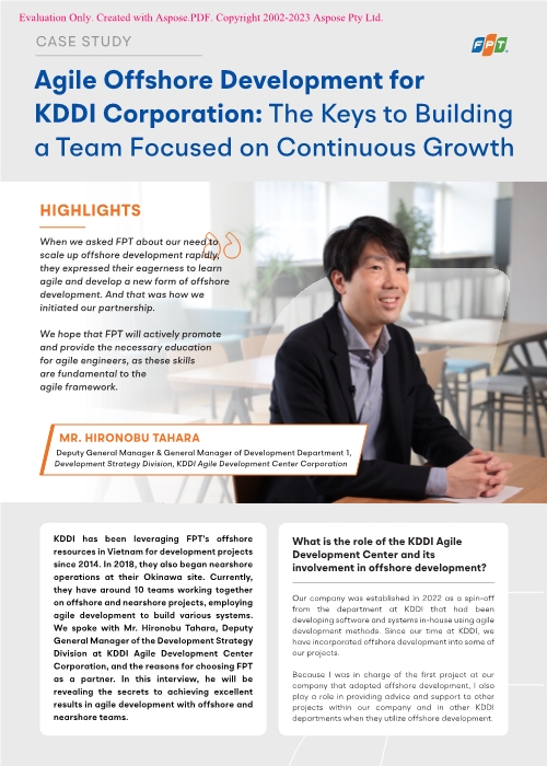 KDDI has been leveraging FPT's offshore resources in Vietnam for development projects since 2014. In 2018, they also began nearshore operations at their Okinawa site. Currently, they have around 10 teams working together on offshore and nearshore projects, employing agile development to build various systems. We spoke with Mr. Hironobu Tahara, Deputy General Manager of the Development Strategy Division at KDDI Agile Development Center Corporation, and the reasons for choosing FPT as a partner. In this interview, he will be revealing the secrets to achieving excellent results in agile development with offshore and nearshore teams.