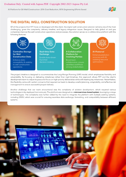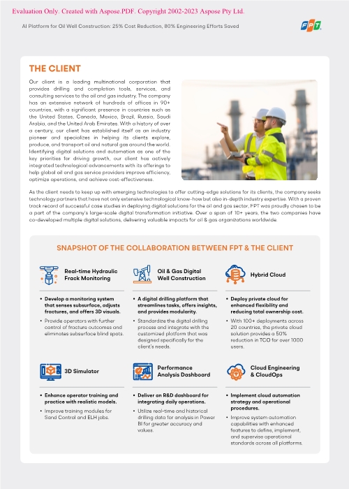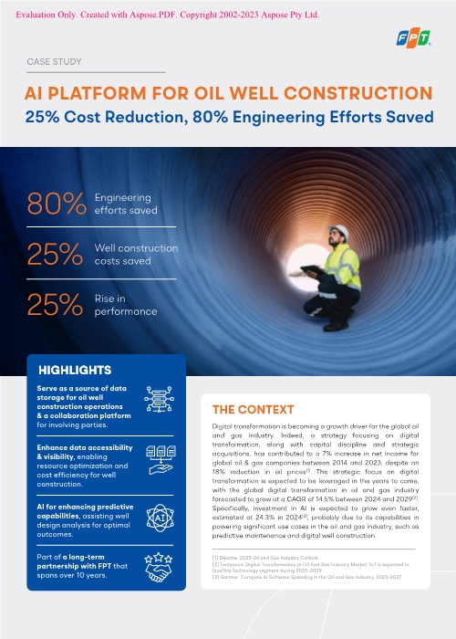 Our client is a leading multinational corporation that provides drilling and completion tools, services, and consulting services to the oil and gas industry. Identifying digital solutions and automation as one of the key priorities for driving growth, the company has actively integrated technological advancements with its offerings to help global oil and gas service providers improve efficiency, optimize operations, and achieve cost-effectiveness. Partnering with FPT, the company has developed an AI-powered well construction solution to streamline the oil well construction process, improve data management, and enhance collaboration among involving parties. As a result, the solution helps reduce the well construction costs by 25%, lower engineering efforts by 80%, and improve performance by 25%.