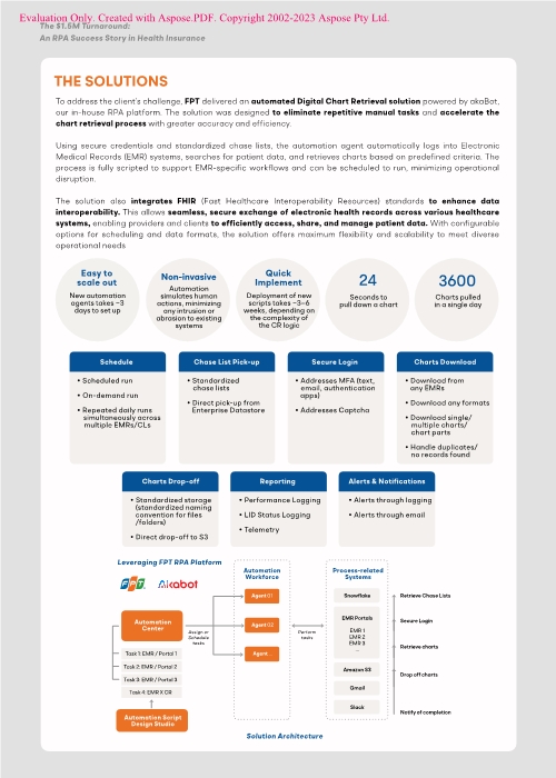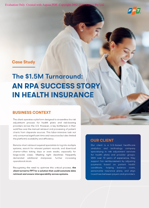 A U.S.-based healthcare analytics company specializing in insurance risk adjustment services needed to overcome a critical bottleneck in its platform: the slow, manual retrieval of patient charts from multiple systems. This labor-intensive process strained resources, limited scalability, and increased costs. To address the challenge, they partnered with FPT to automate chart retrieval and ensure seamless interoperability. The result was streamlined operations, reduced errors, and approximately $1.5M in annual labor cost savings.