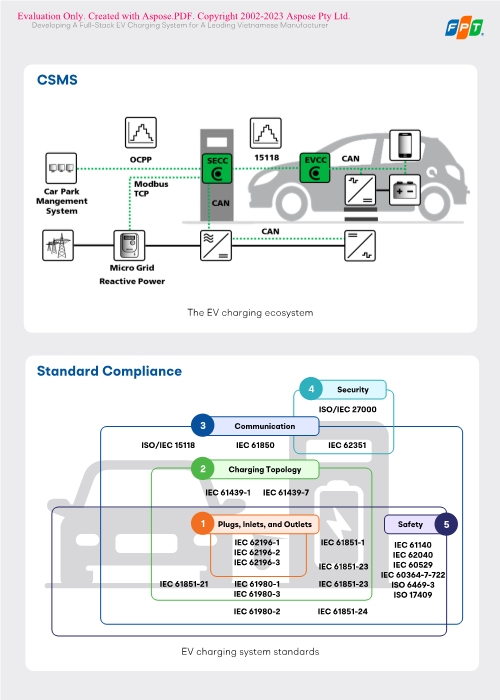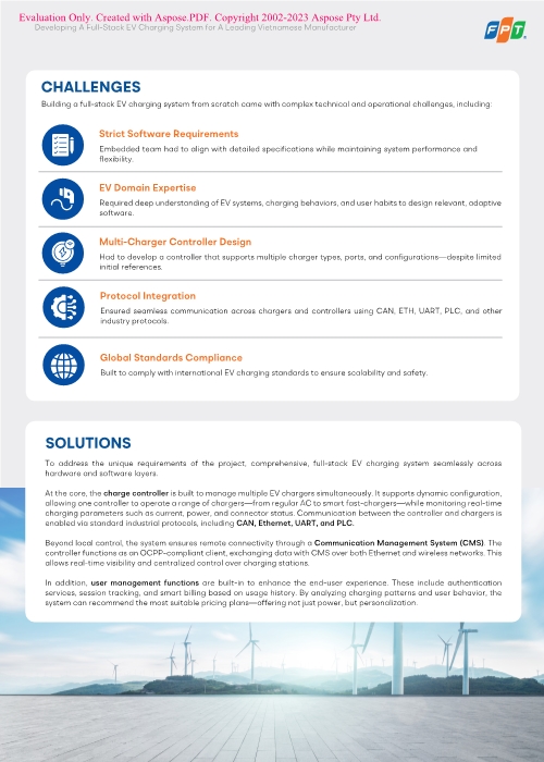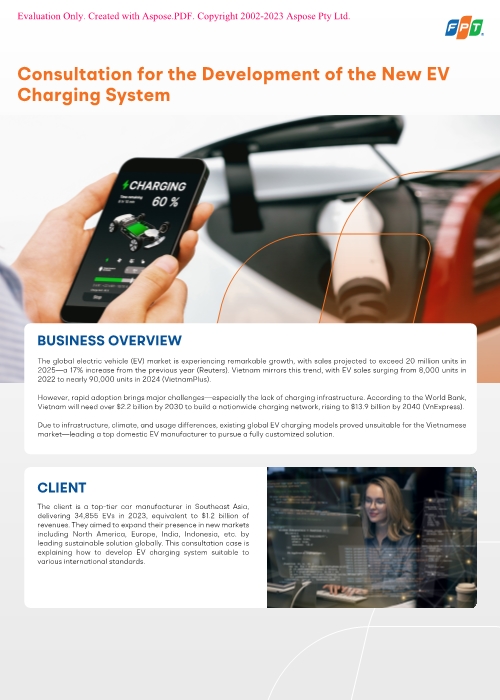 The client is one of the leading car manufacturers in Southeast Asia. Building a full-stack EV charging system from scratch posed significant technical challenges, such as designing a multi-charger controller, integrating various communication protocols (CAN, ETH, UART, PLC), and ensuring compliance with global standards. To overcome these hurdles, the client partnered with FPT, leveraging its deep EV expertise and robust software capabilities to achieve seamless hardware-software integration, scalability, safety, and high system performance.