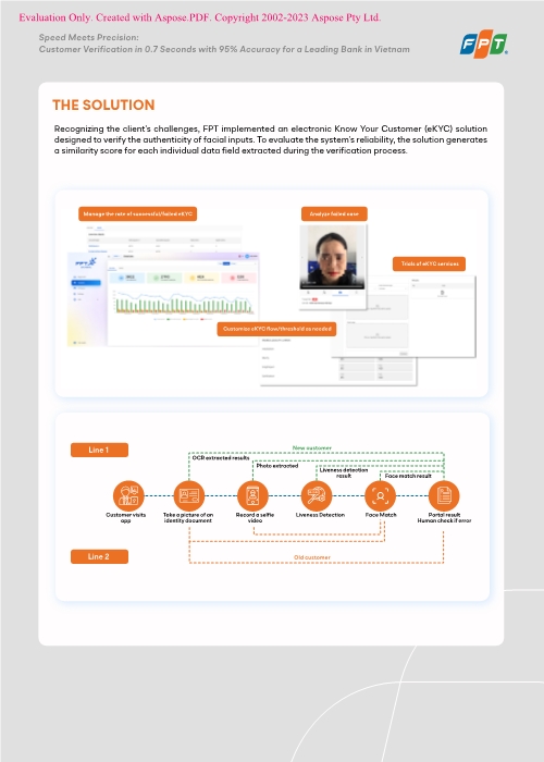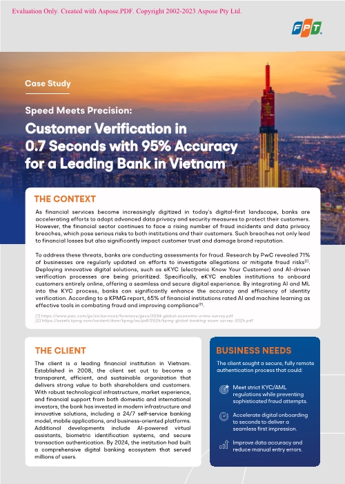 Established in 2008, the client set out to become a transparent, efficient, and sustainable organization that delivers strong value to both shareholders and customers. However, the client needed a secure, remote authentication solution to meet KYC/AML compliance, prevent fraud, speed up onboarding, and enhance data accuracy. As a solution, FPT implemented eKYC designed to verify the authenticity of facial inputs.