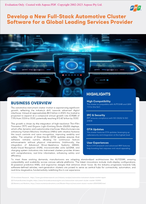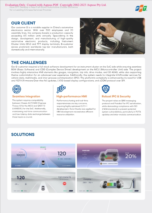 A leading Chinese automotive electronics supplier needed a full-stack software solution for its next-generation instrument cluster, integrating advanced HMI features, real-time vehicle data, and secure OTA updates. FPT delivered a comprehensive platform combining AUTOSAR Classic and QNX, optimized for performance, scalability, and cybersecurity. This enabled the client to accelerate time-to-market, enhance user experience, and ensure future-proofing for software-defined vehicles.