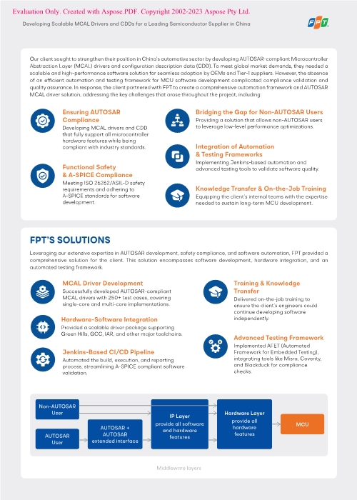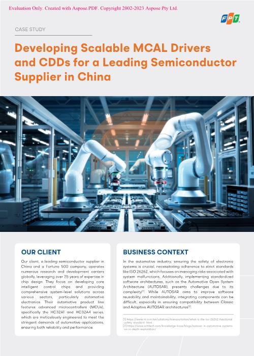 A leading semiconductor supplier sought to strengthen their position in China’s automotive sector by developing AUTOSAR-compliant Microcontroller Abstraction Layer (MCAL) drivers and configuration description data (CDD). However, the absence of an efficient automation and testing framework for MCU software development complicated compliance validation and quality assurance. In response, the client partnered with FPT to create a comprehensive automation framework and AUTOSAR MCAL driver solution