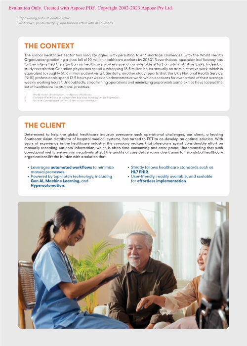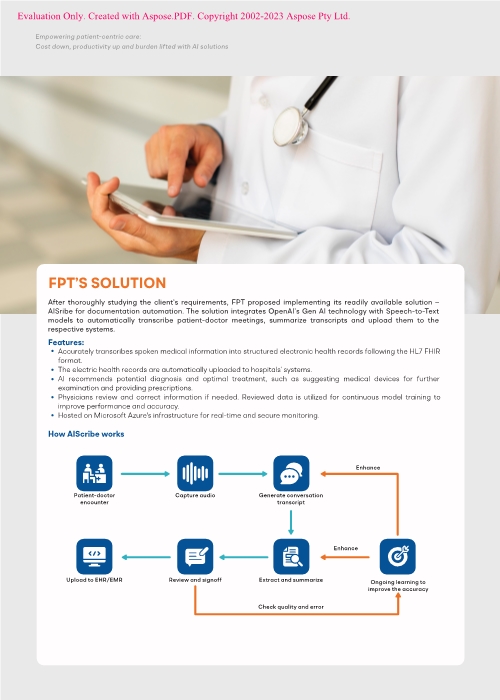Determined to help the global healthcare industry overcome talent shortage, our client, a leading Southeast Asian distributor of hospital medical systems, has partnered with FPT to develop the AIScribe solution for streamlining healthcare administrative operations. Integrating OpenAI’s Gen AI technology with Speech-to-Text models, the solution can automatically transcribe patient-doctor meetings, summarize transcripts, and upload them to the respective systems. AIScribe managed to reduce medical documentation time by 50%, lower healthcare workers’ feelings of burnout and fatigue by 70%, and is reported to increase documentation quality by 75% of physicians.