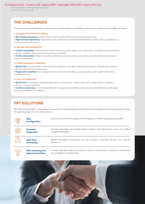 The client is a global professional services and technology firm that partners with businesses in highly regulated markets, particularly within the insurance and financial services sectors. However, the client faced operational and technological obstacles in underwriting, including complex and inflexible rule management, limited system integrations, and a lack of transparency in automated decisions. These challenges led to slow updates, manual workflows, and difficulty detecting bias. Thus, FPT offers UnderwriteX - a low-code platform that streamlines rule management and new business creation.