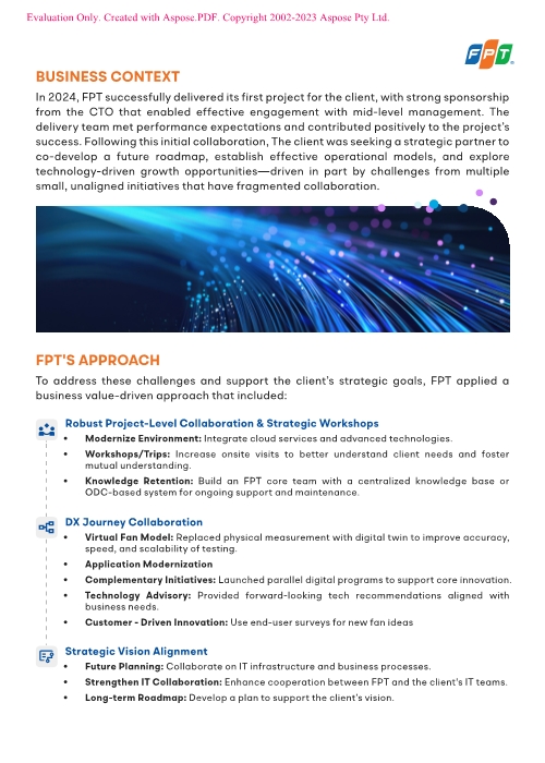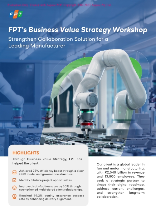 Faced with fragmented collaboration and unclear digital direction, a global leader in fan and motor manufacturing turned to FPT to co-develop a long-term strategy. Through our Business Value Strategy Workshop, we addressed pain points with a structured approach—enhancing delivery alignment, building a centralized ODC model, and fostering stronger engagement from CTO to project teams. As a result, the client saw a 25% boost in efficiency, a 30% rise in satisfaction, and a 99.2% QA success rate. We also identified eight future initiatives across AI, IoT, and digital R&D—laying the foundation for sustainable, innovation-driven growth.