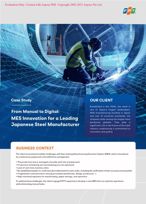 One of Japan’s largest steelmakers partnered with FPT to develop a new Manufacturing Execution System (MES) to modernize operations and eliminate manual tasks. The new MES integrates all existing business processes while introducing features that automate workflows, streamline operations, and provide real-time data visibility. This helped the client reduce costs, improve efficiency, and enhance responsiveness to production demands.