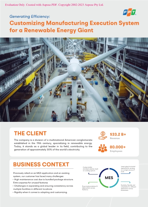 Our client, a renewable energy company headquartered in the US, previously struggled with an outdated MES application, facing high maintenance costs, unnecessary expenses for unused features, challenges in expansion and consistency across various locations, and a lack of flexibility. To address these issues, FPT Software designed a new MES solution focused on essential modules that allow for incremental development and enhanced capabilities. This solution emphasizes flexibility, affordability, and scalability, overcoming the limitations of the old system. By incorporating horizontal applications, our MES acts as a centralized platform for all manufacturing data, ensuring accuracy, consistency, and real-time visibility. Our approach is centered on meeting customer needs with ease of use, affordability, and flexibility, helping organizations meet their operational objectives more efficiently.