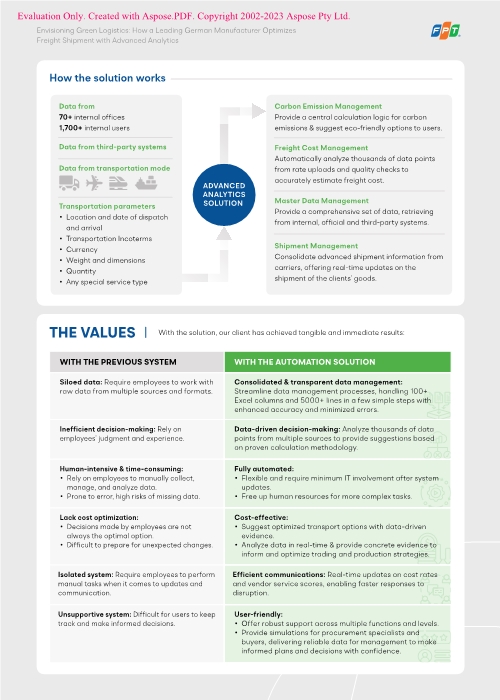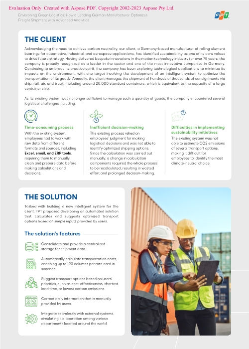Our client is a leading manufacturer of rolling element bearings for automotive, industrial, and aerospace applications, proudly recognized as one of the most innovative companies in Germany. Striving to minimize its impact on the environment, the company has partnered with FPT to develop an advanced analytics solution that performs highly complicated calculations to suggest optimal transport options for freight shipment. With the solution, our client has successfully streamlined data management processes, improved data-driven decision-making, and ultimately achieved cost effectiveness and carbon neutrality.