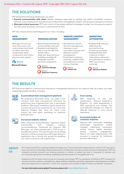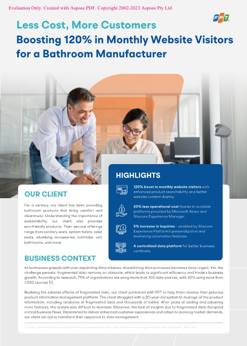 Our client is a prominent provider of bathroom products. Our client grapples with fragmented data as their business grows, which could lead to disrupted business flows. Besides, their 20-year-old system was inefficient in handling voluminous amounts of data. Therefore, our client partnered with FPT to leverage Sitecore technologies and Microsoft Azure to streamline data management and deliver a seamless shopping experience. Therefore, our client experienced a 120% boost in monthly site visitors, reduced cost, and more efficient data management.