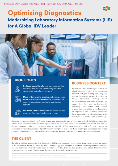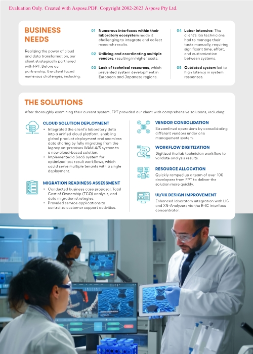 Our client, a global leader in in-vitro diagnostics, partnered with FPT to address challenges with collecting laboratory results, managing multiple vendors, and lack of technical resources. FPT Software assessed migration readiness, deployed cloud solutions, and consolidated multiple retailers. As a result, our client reduced operational costs, improved data sharing, and enhanced user experience.