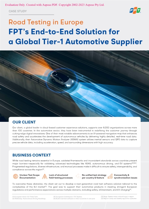 Road testing is crucial in Europe, yet barriers like outdated frameworks and inconsistent standards hinder the validation of emerging technologies such as ADAS and autonomous driving. Our client, a global leader in cloud-based customer experience solutions, aims to address these challenges by developing a next-generation road test software tailored to the EU market. They partnered with FPT to design a robust testing framework that meets stringent European regulations and performance expectations across various domains, including safety and EV charging.