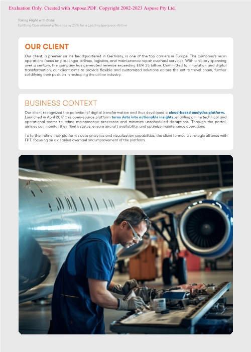 Our client, a premier airline headquartered in Germany, recognized the potential of digital transformation and thus developed a cloud-based analytics platform. To further refine their platform’s data analytics and visualization capabilities, the client formed a strategic alliance with FPT Software, focusing on a detailed overhaul and improvement of the platform.