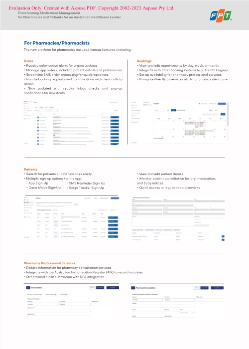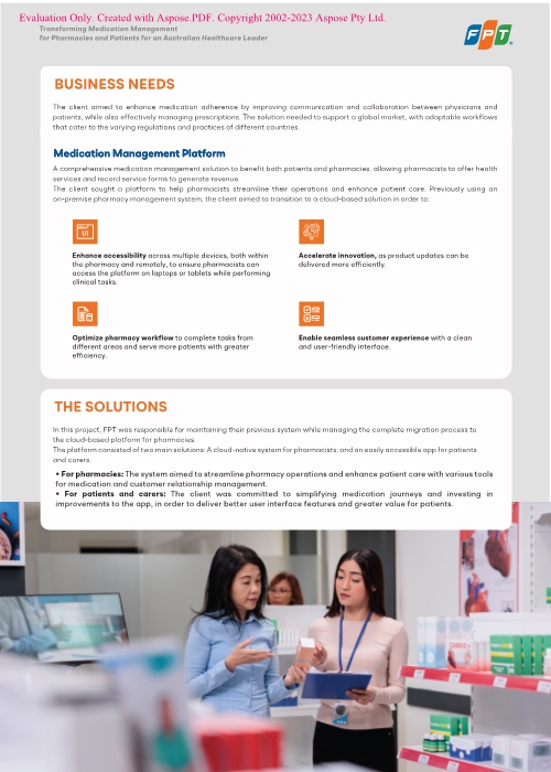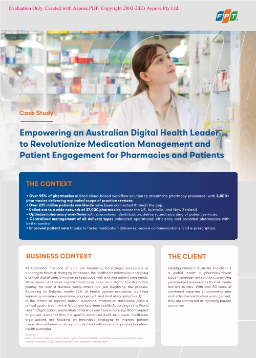 Headquartered in Australia, the client is a global provider of pharmacy-led patient engagement solutions. To improve medication adherence, the client aimed to strengthen communication between physicians and patients while streamlining prescription management. The solution needed to support a global market with flexible workflows tailored to diverse regulatory and clinical practices. FPT supported the initiative by maintaining the existing legacy system and leading the complete migration to a cloud-based platform for pharmacies and patients. The new platform features a cloud-native system for pharmacists and a mobile app for patients and carers, offering tools for medication management, appointment scheduling, and service delivery.