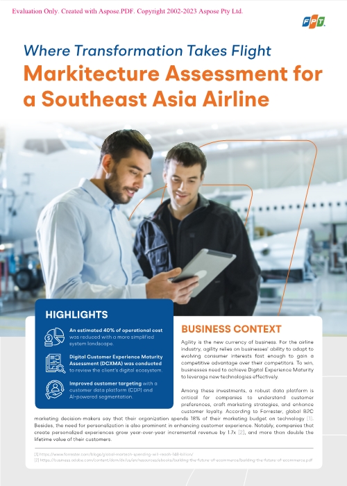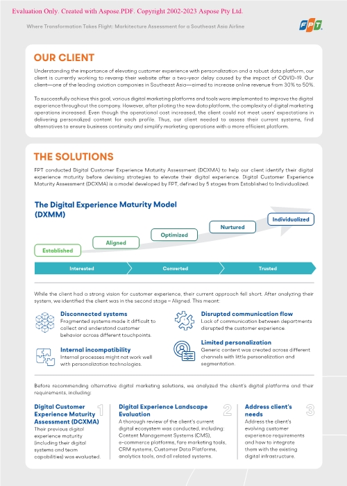 Understanding the importance of elevating customer experience with personalization and a robust data platform, our client—one of the leading aviation companies in Southeast Asia—aimed to revamp their website. However, our client faced various challenges: complex digital marketing operations, increased operational costs with limited personalization for end users. Thus, FPT conducted Digital Customer Experience Maturity Assessment (DCXMA) to help our client identify their digital experience maturity before devising strategies to elevate their digital experience.