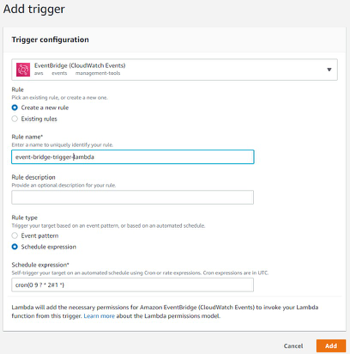 In this example, I put the information as cron(0 9 ? * 2#1 *). That means this Lambda function will run every month on the first Monday at 9:00 a.m.