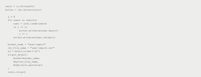 The result after querying to Config will be in the form of JSON. To easily read and edit the file content, we can convert the data to CSV format. We'll process the data a little before converting it to CSV and saving it to an S3 bucket: