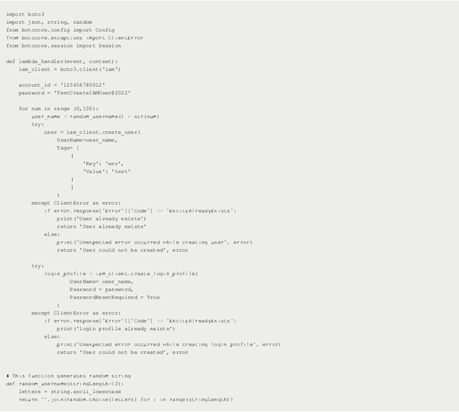 Before running the Lambda function to generate the report, you can use the following code to create new users. This code will create 100 new users with randomly generated usernames.