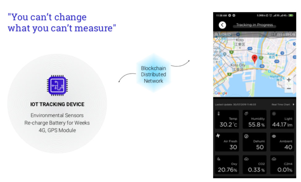 Figure 1: Operation of IoT on Blockchain and screenshot of the environment monitoring app