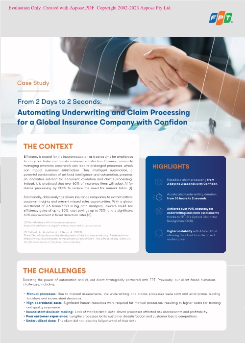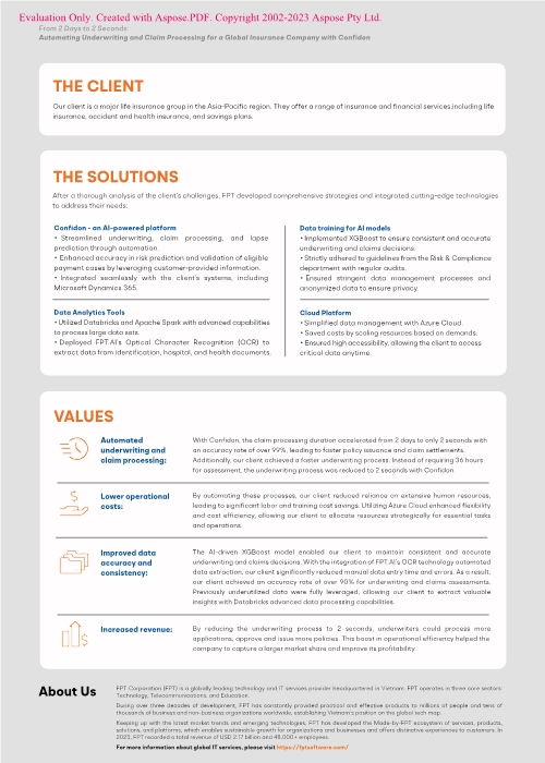 Unser Kunde, eine führende Lebensversicherungsgruppe im asiatisch-pazifischen Raum, stand vor zahlreichen Herausforderungen, darunter manuelle Prozesse, hohe Betriebskosten, eine unzureichende Customer Experience sowie ungenutzte Datenpotenziale. Um diese Probleme zu lösen, implementierte FPT Software Confidon, eine KI-gestützte Plattform in Kombination mit Cloud-Technologien und Datenanalyse-Tools.