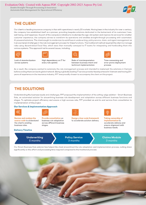 In Zusammenarbeit mit FPT implementierte der Kunde Smart Business Rule, eine von FPT entwickelte Lösung zur Automatisierung der Erstellung und Anpassung von Geschäftsregeln über verschiedene Geschäftsbereiche und Prozessstufen hinweg.