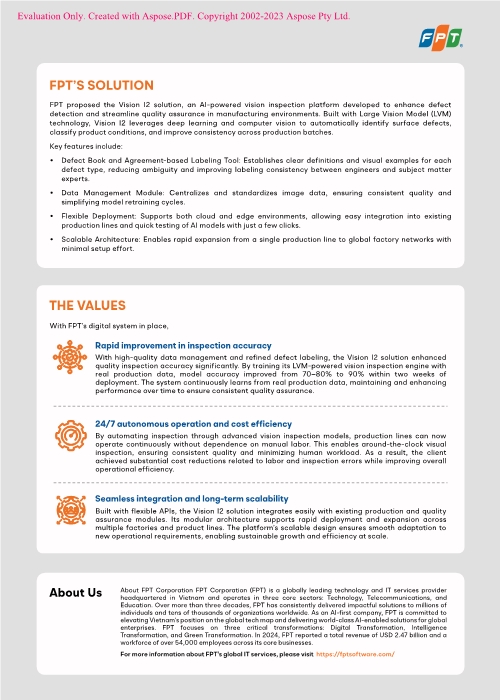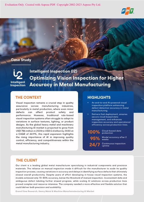 Die I2 visionAI-Lösung von FPT ist ein KI-gestütztes visuelles Inspektionssystem, das mithilfe fortschrittlicher Computer-Vision-Technologien mikroskopisch kleine Oberflächenfehler präzise erkennt. Das intelligente System beseitigt den Engpass inkonsistenter Produktqualität in der Stahlproduktion – eine Herausforderung, die durch manuelle Inspektionen nicht zuverlässig gelöst werden konnte.