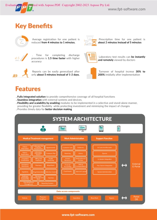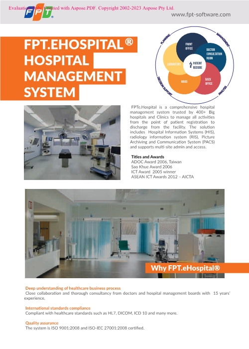 FPT eHospital is a comprehensive hospital management system trusted by 400+ big hospitals and Clinics to manage all activities from patient registration to discharge from the facility. The solution includes Hospital Information Systems (HIS), Radiology information systems (INF), Picture Archiving and Communication Systems (PACS) and supports multi-site admin and access.